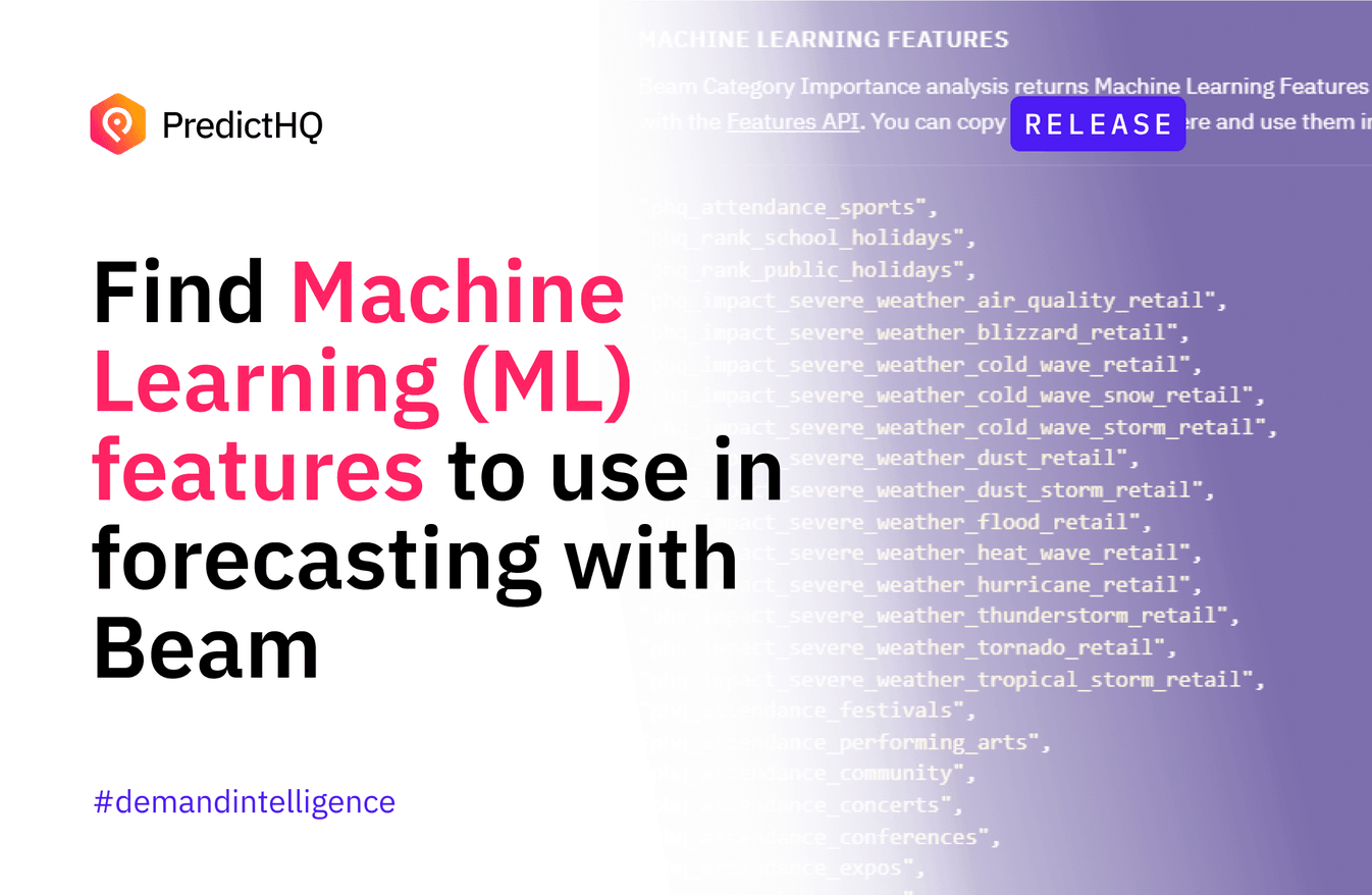 To add events to your forecast, you need to implement machine learning (ML) features for events. We have found that creating new ML features can be time-consuming and expensive. It can take a significant amount of time for data scientists, data engineers, and others. PredictHQ provides a toolkit to allow you to easily integrate prebuilt, forecast-ready ML features with Beam and the Features API. We’ve made some updates to make this process even easier.