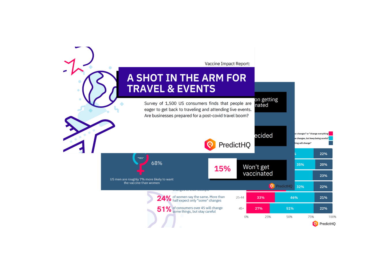 SAN FRANCISCO, CA. – April 14, 2021 – PredictHQ, the demand intelligence company, today announced findings from its Vaccine Impact Report: The State of Travel and Live Events study, that found people are eager to get back to traveling and attending live events and many are likely to attend an event of more than 1,000 people in the next 3 to 6 months. The study, of 1,500 US consumers, also found that over half of respondents are so confident in the vaccine that they’re definitely planning on attending in-person/live events after vaccination.