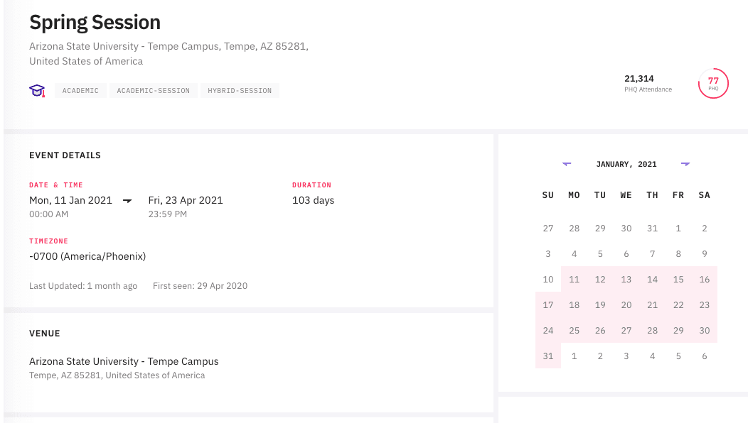 Tracking academic events is specific to each institution. With our single source of truth, you’ll save time manually searching university websites and calendars with our verified data. We know from our customers that it takes 15 minutes to manually source, verify, and store each event. Multiply that across all US universities with many events each, and you have quite an undertaking.