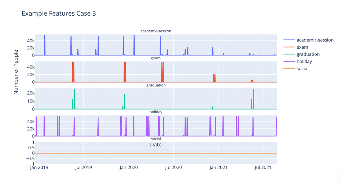 PredictHQ tracks the key dates of every US college with more than 5,000 students. Think graduations, exam time and spring break. There is no other way to track the chaotic movement of students as all universities have their own schedules.