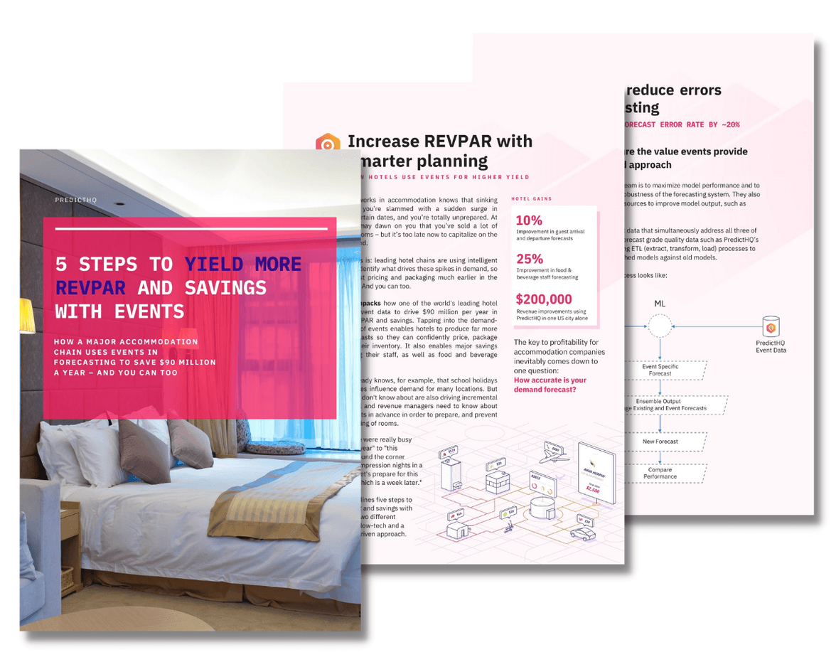The key to profitability for accommodation companies inevitably comes down to one question: How accurate is your demand forecast? Find out how to use event data in your pricing and packaging strategy to make the most of your occupancy and ensure higher revenue. This report unpacks how one of the world's leading hotel chains uses event data to drive $90 million per year in increased REVPAR and savings.